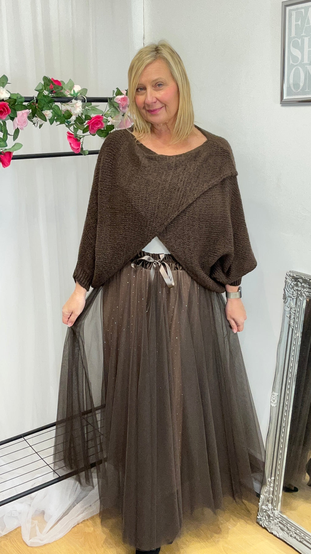 • Get ready for the party season with this striking dazzle net skirt in chocolate