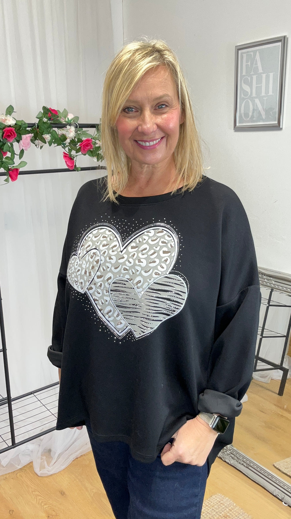 • Hearts, diamantés and animal print detail to the front
