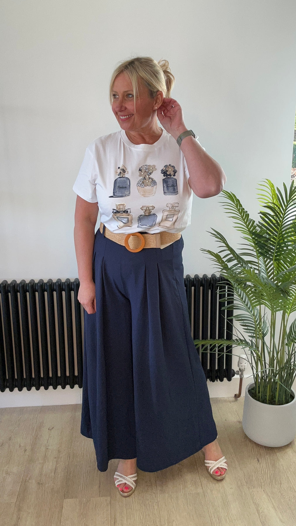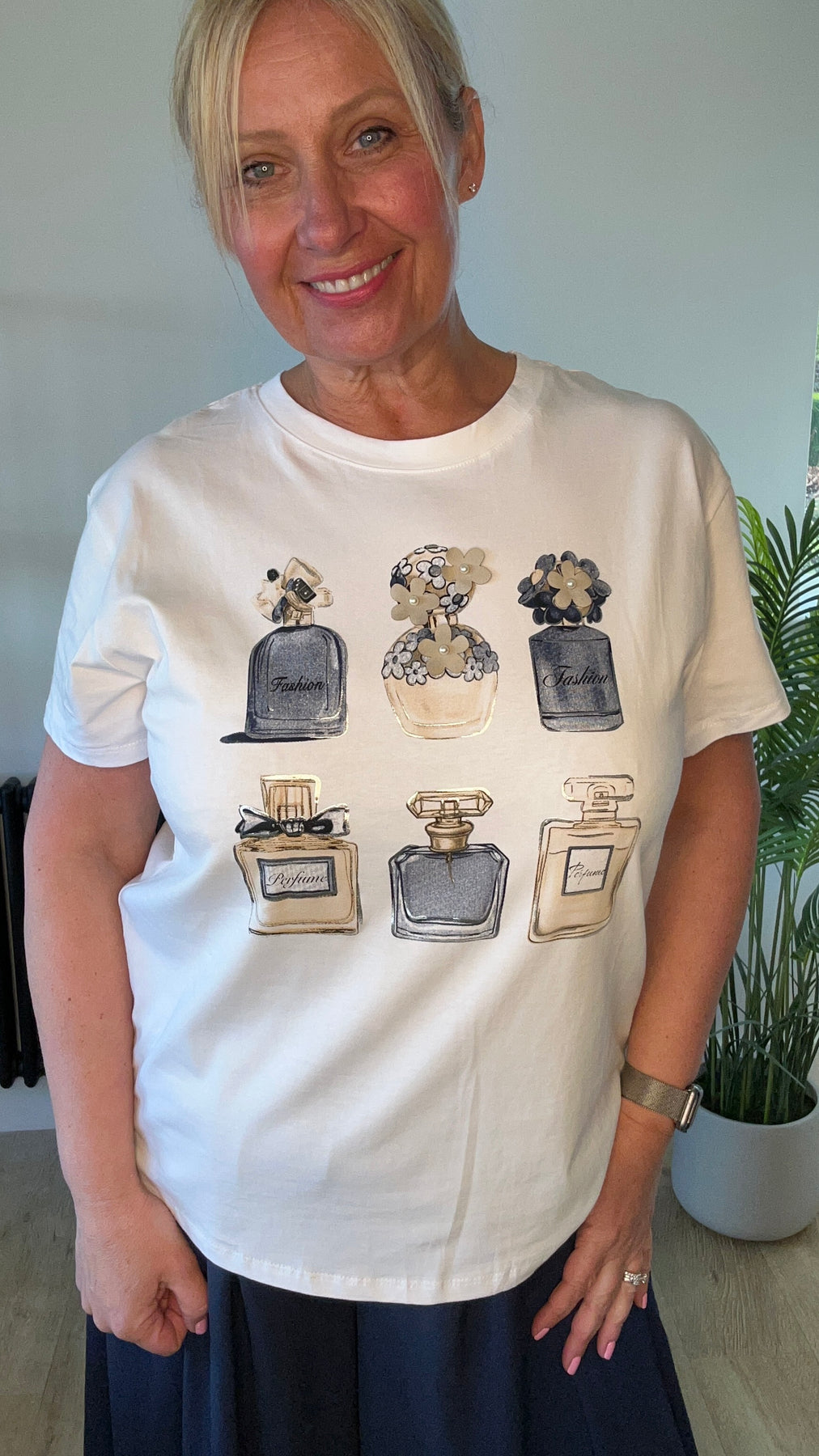 • White tshirt with perfume bottles and 3d daisy’s