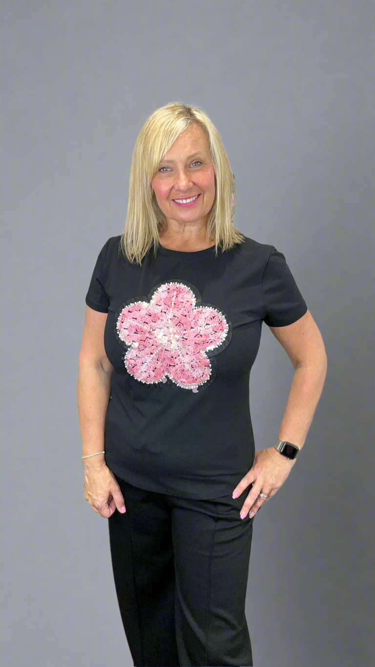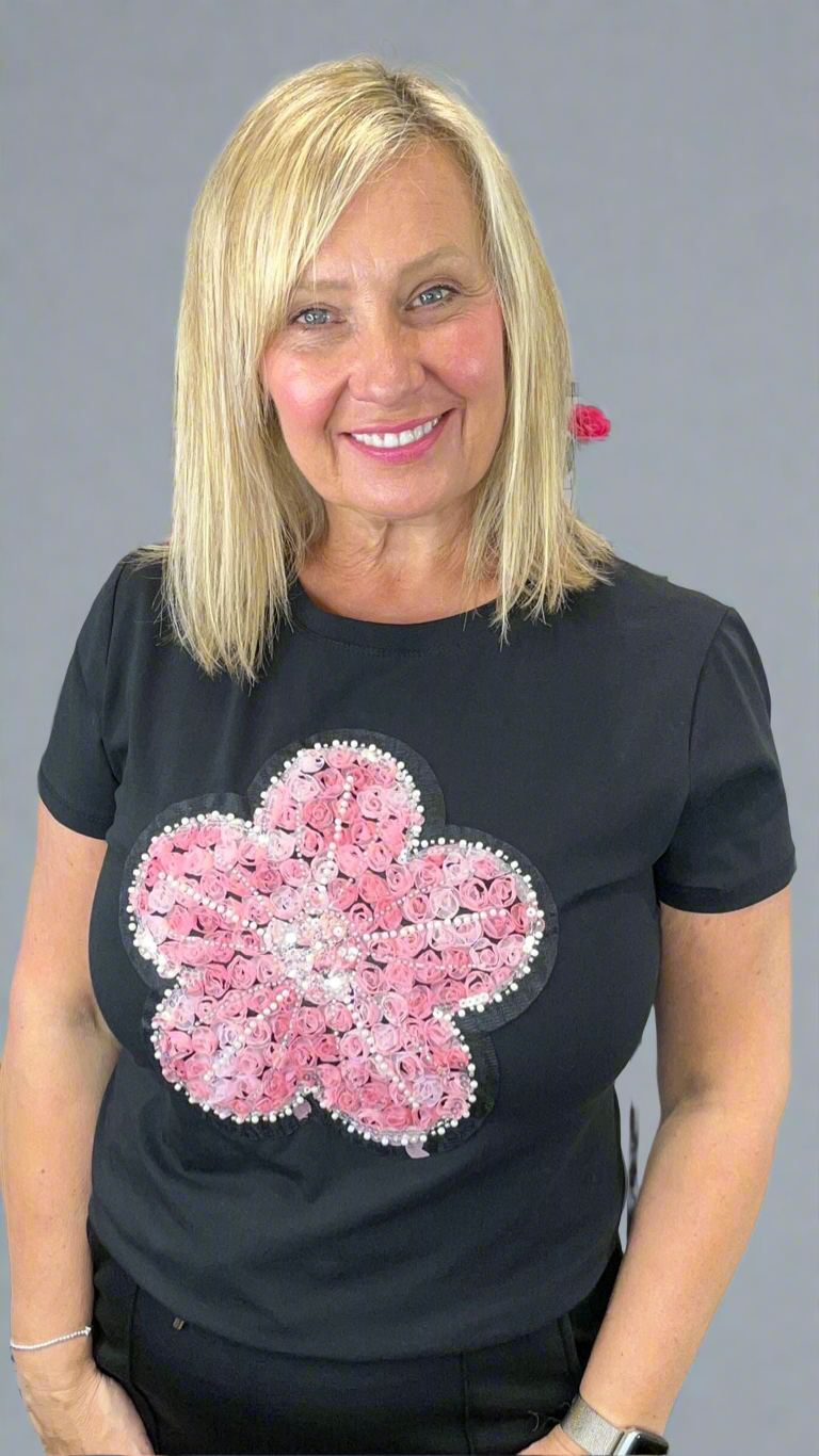 - Black t-shirt with a single flower with Pearl and Sequin embellishment