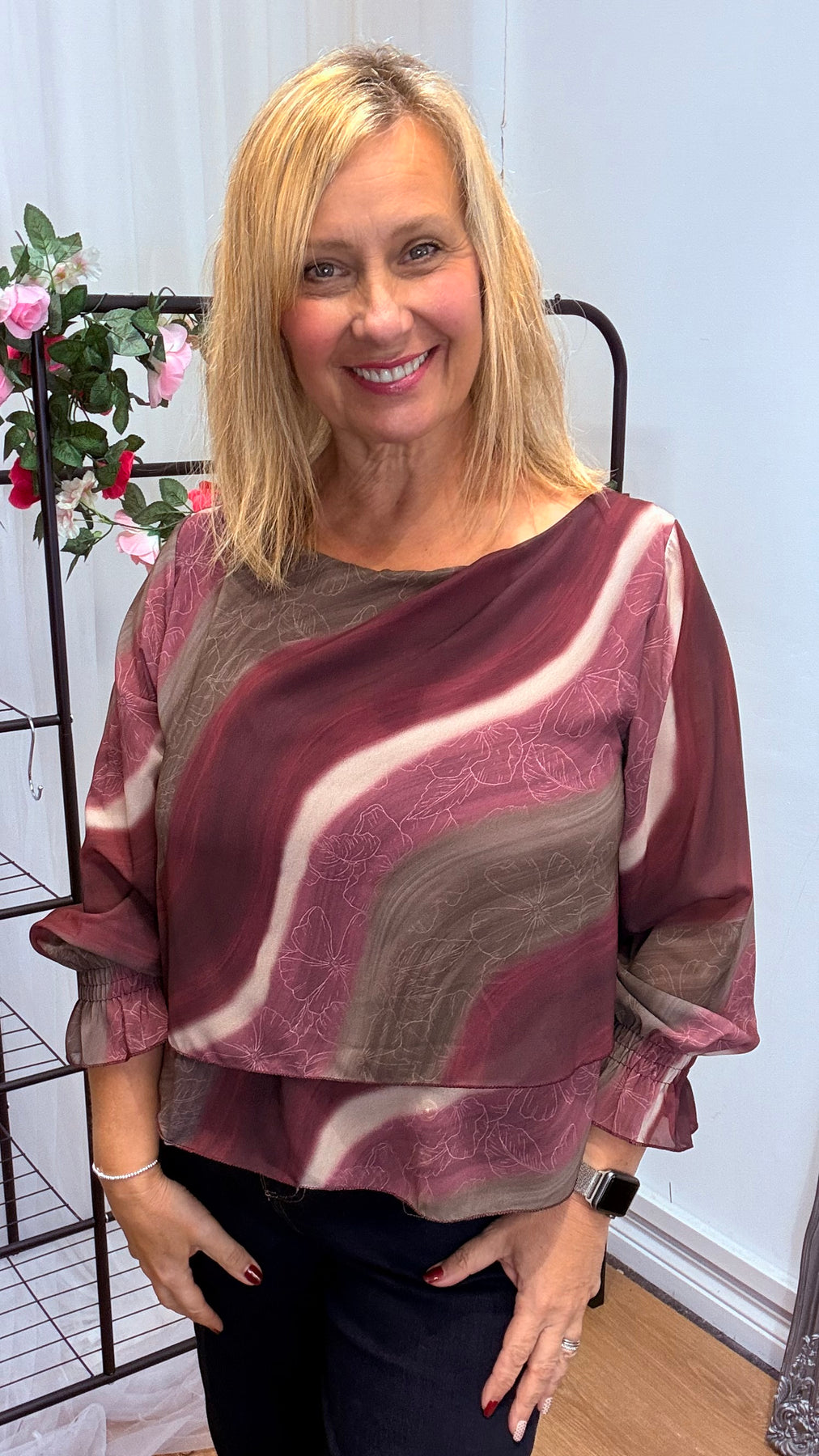 Regular price £28.00- Suzie blouse in wine with chocolate and cream pattern