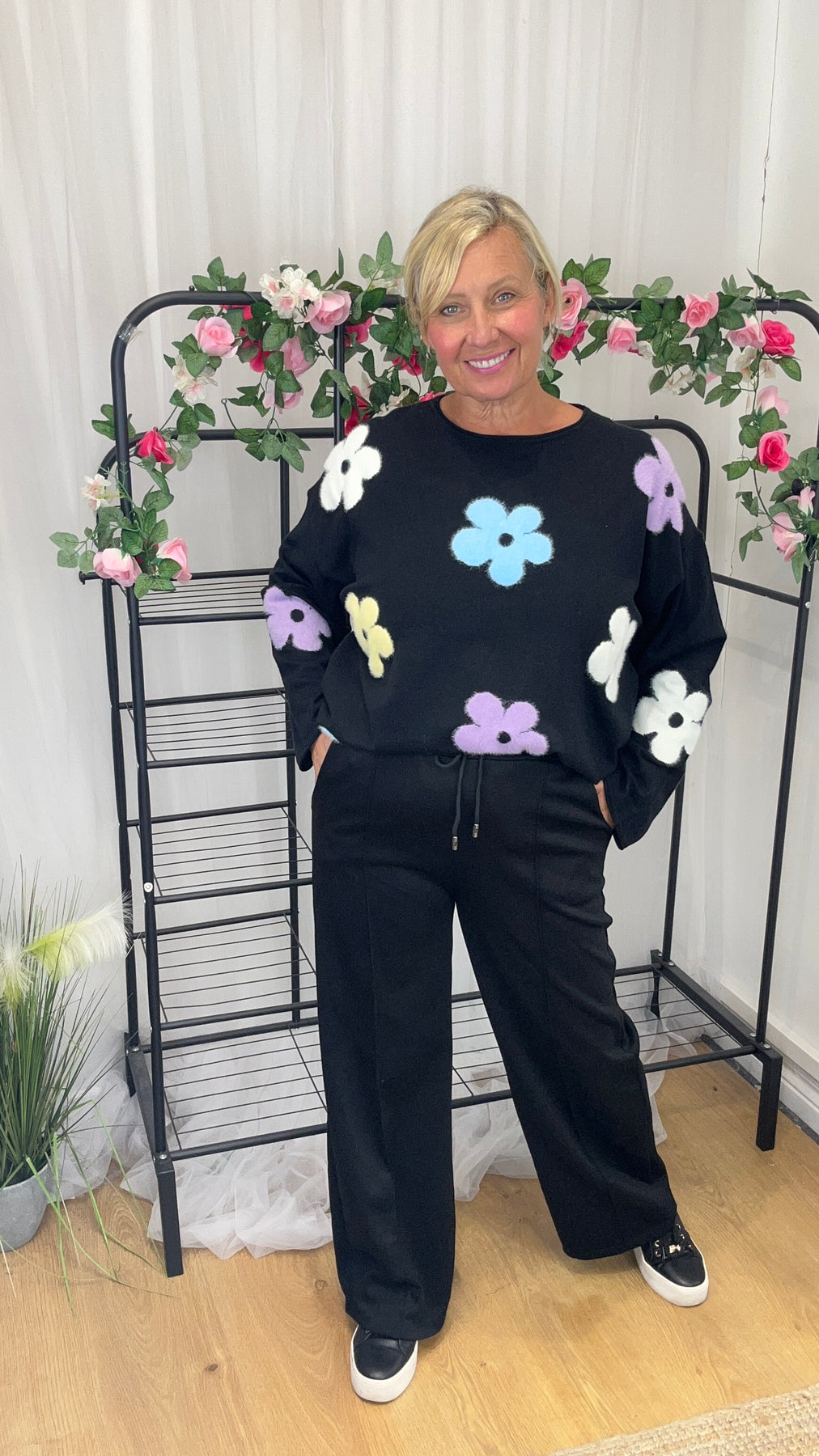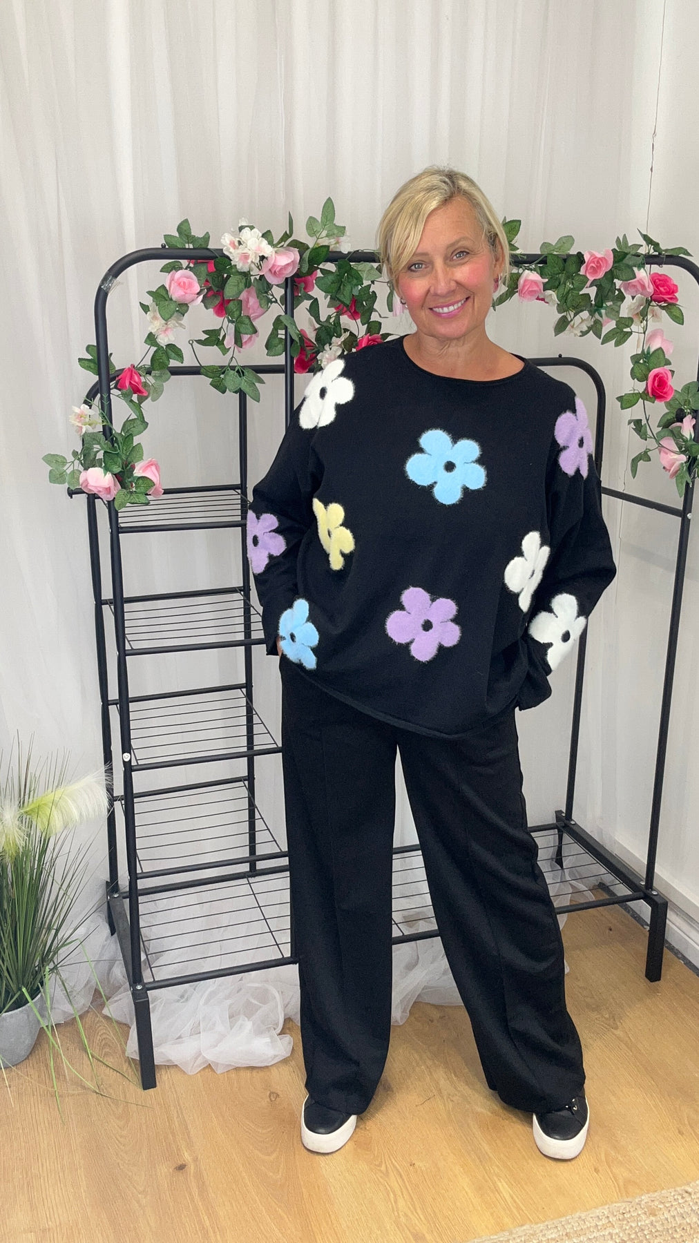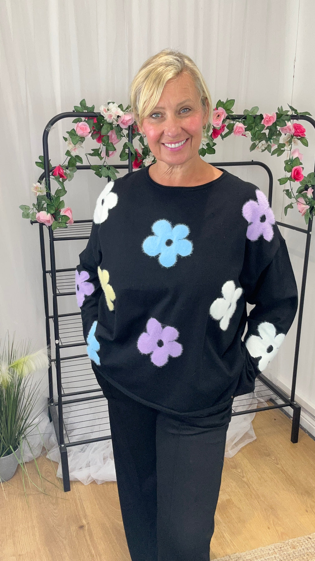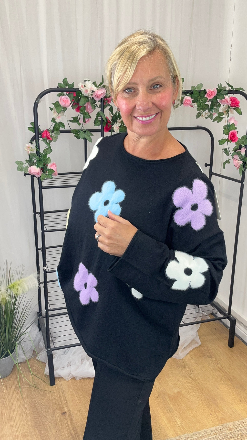 • Black with coloured flowers to the front and sleeves