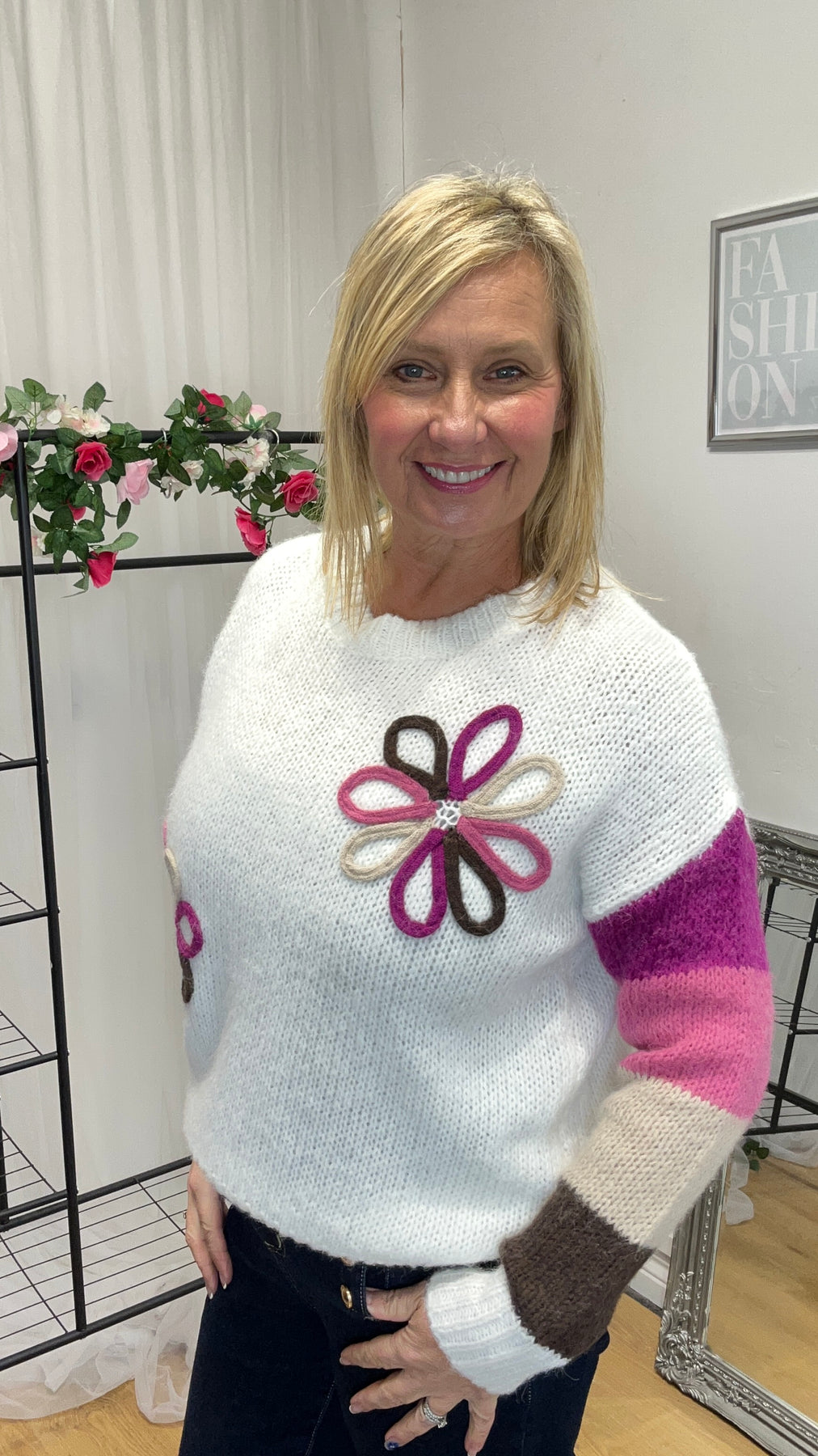 - The long sleeves are striped in the same chocolate, stone and pink colours