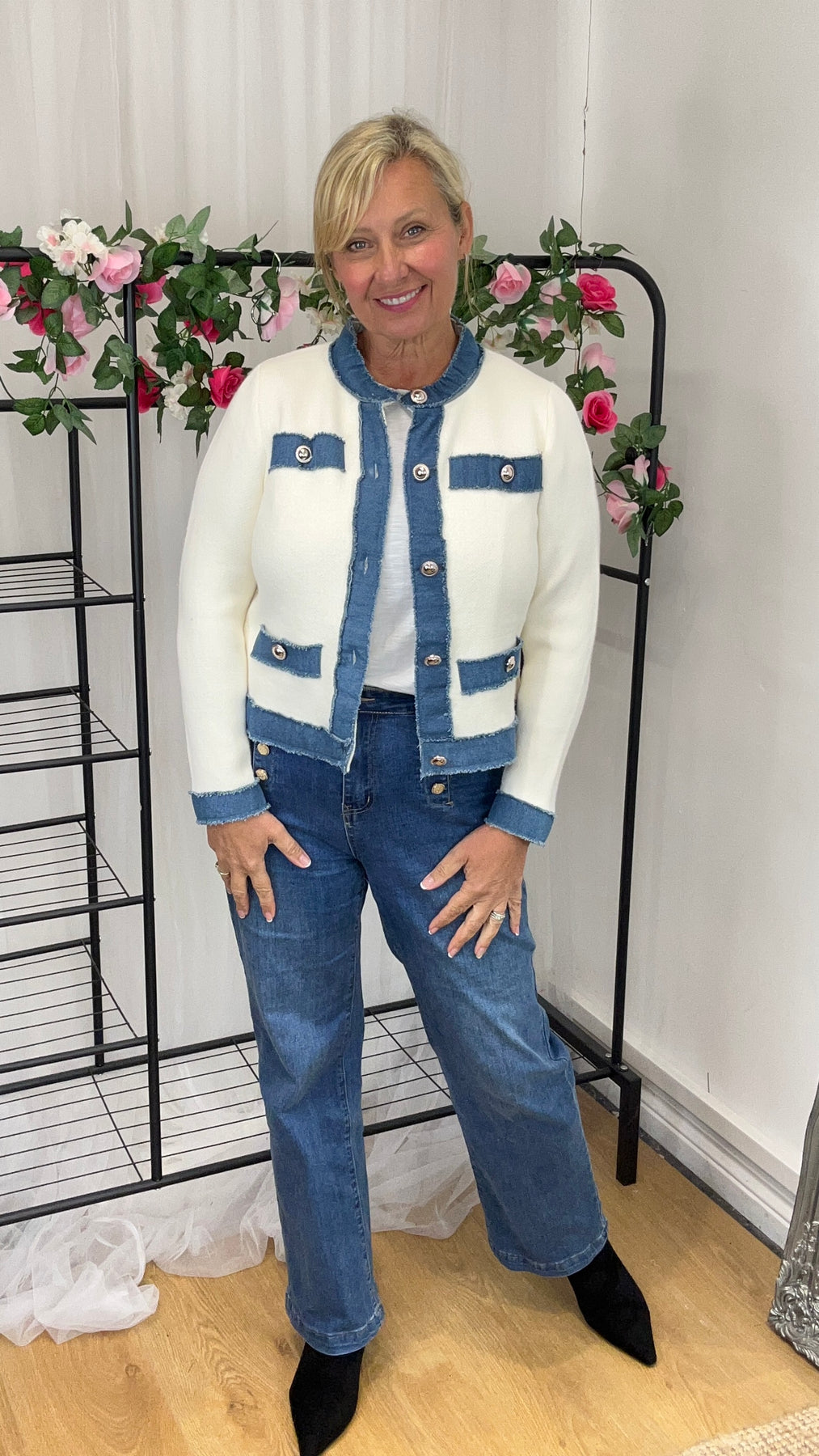 - Blue denim detail to cuffs, neckline, faux pockets & hem