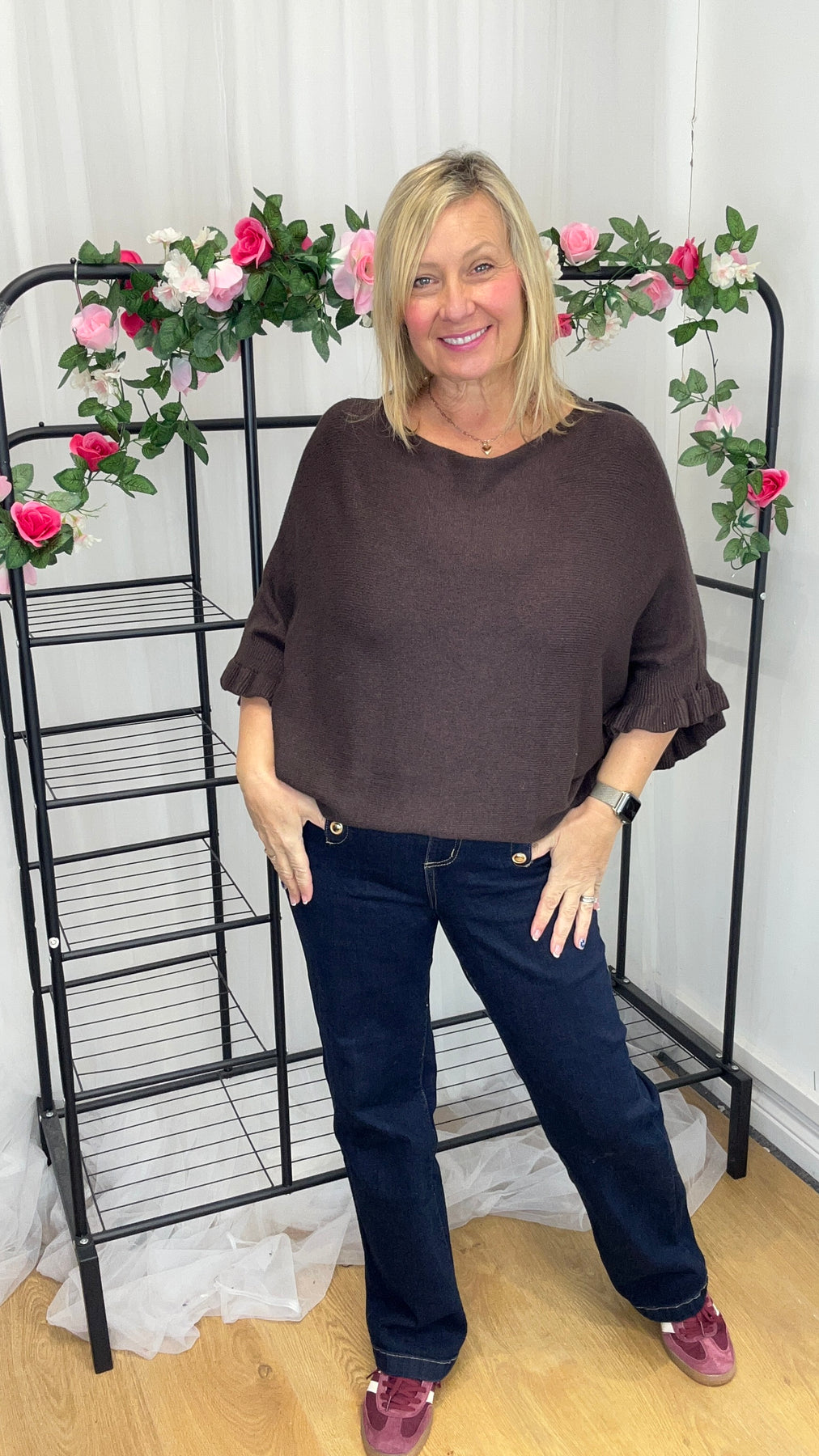 • Striking Vicky fluted sleeve jumper in chocolate