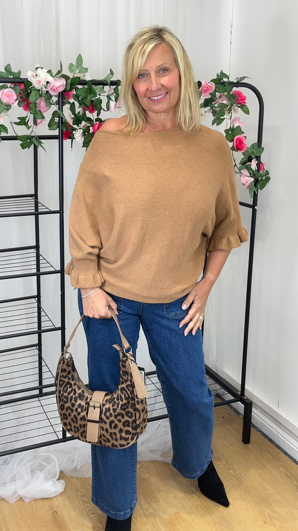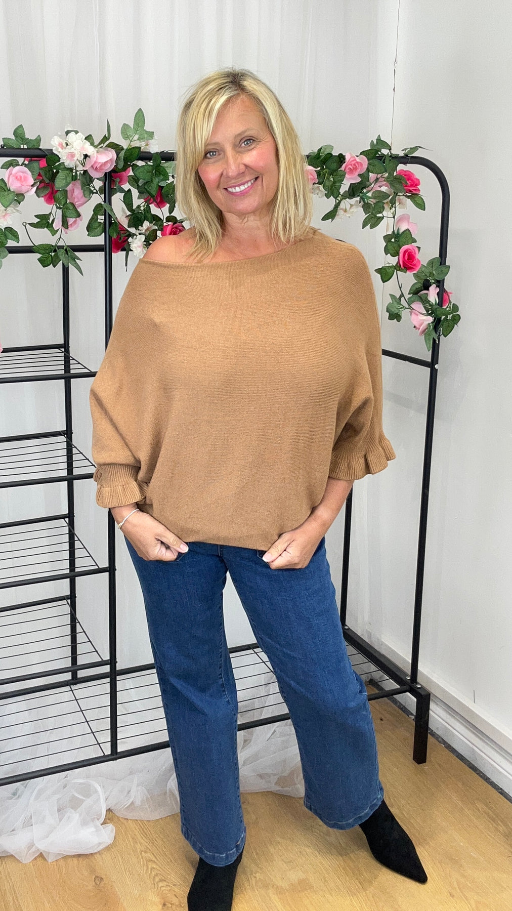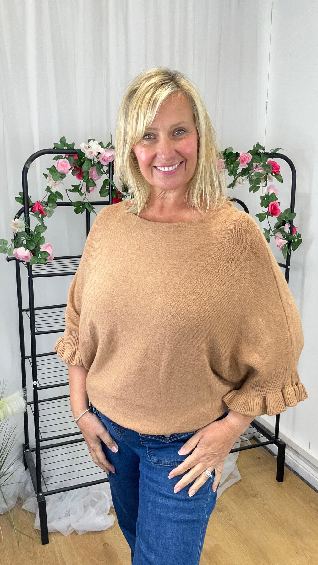Regular price £25.00- Striking Vicky fluted sleeve jumper in camel