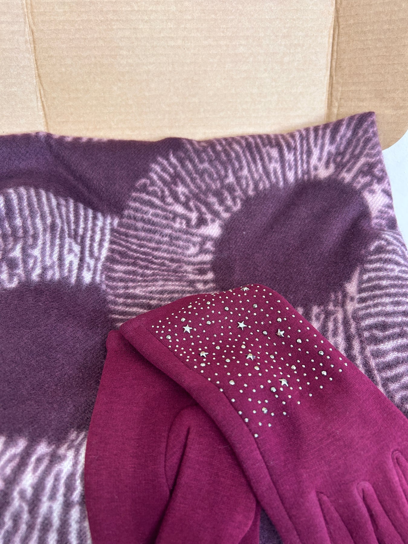 Regular price £25.00- Gorgeous berry tie- dye scarf and matching berry sparkle star gloves