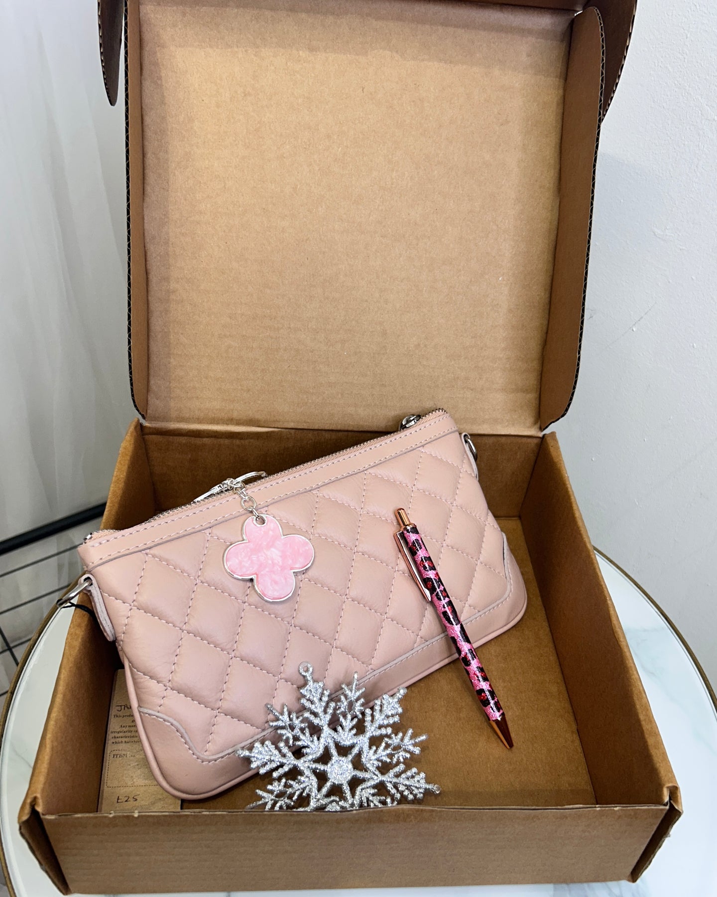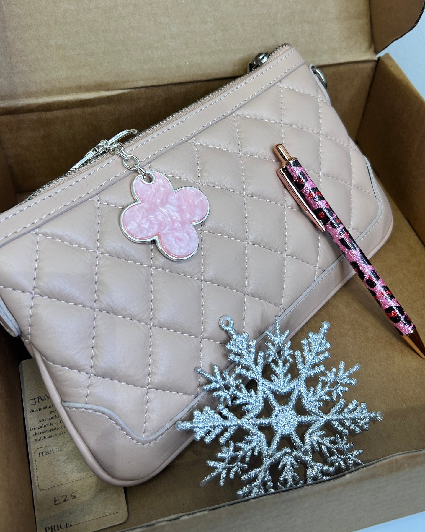 • Dusky pink Leather clutch bag , clover key ring and pen