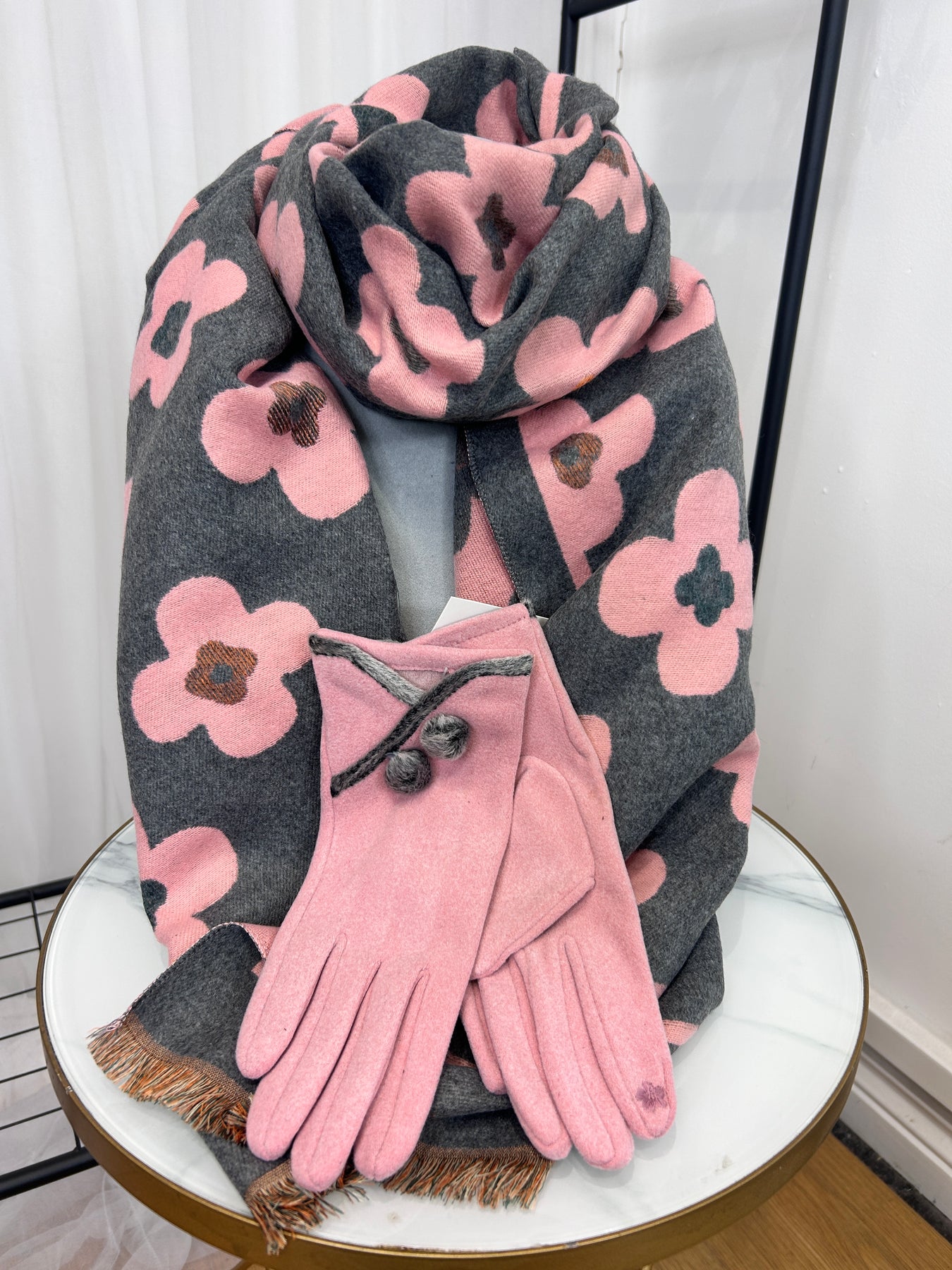 Regular price £11.50- Pink Pom Pom gloves in pink with grey trim & pom poms