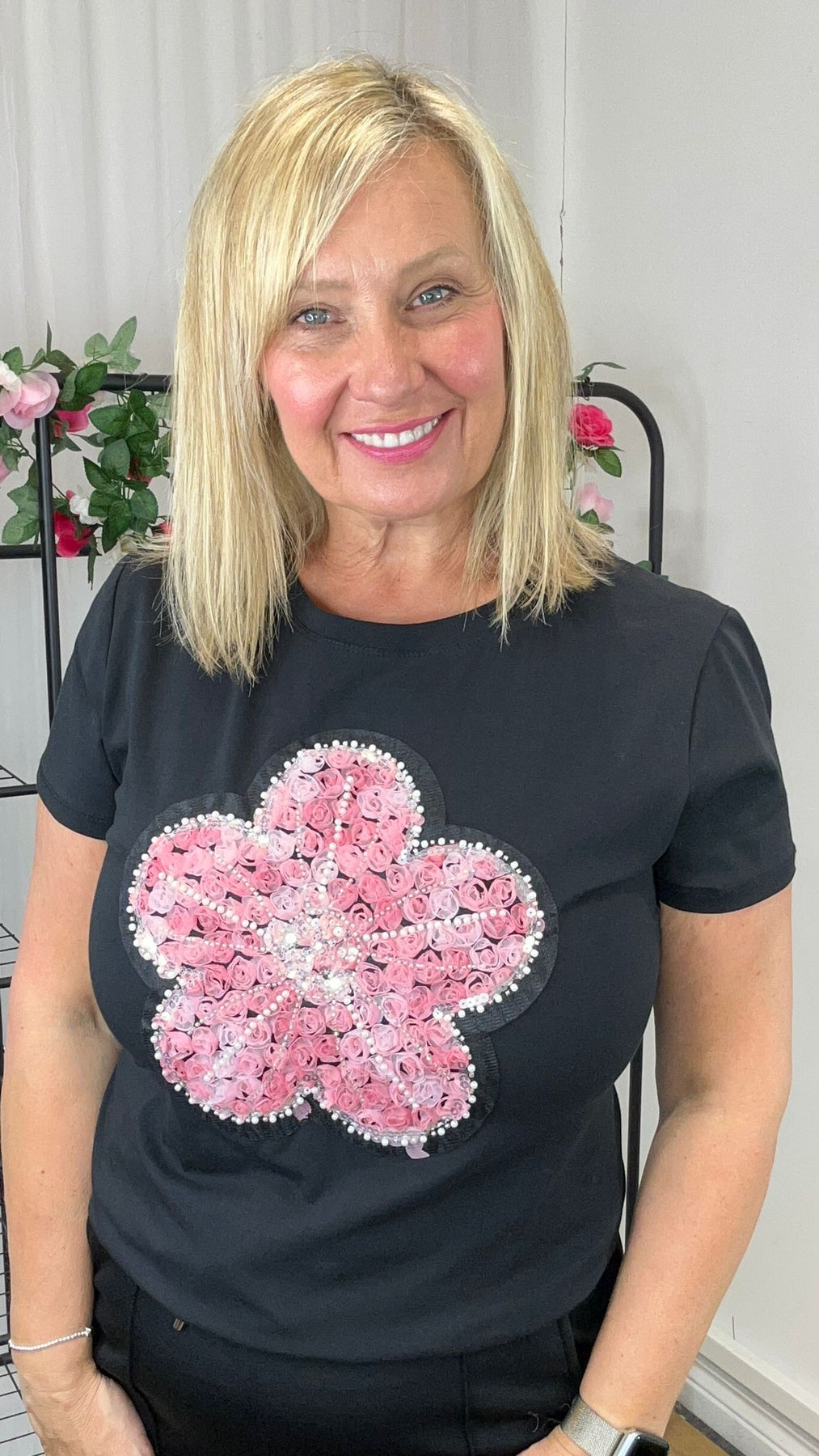 - Black t-shirt with a single flower with Pearl and Sequin embellishment