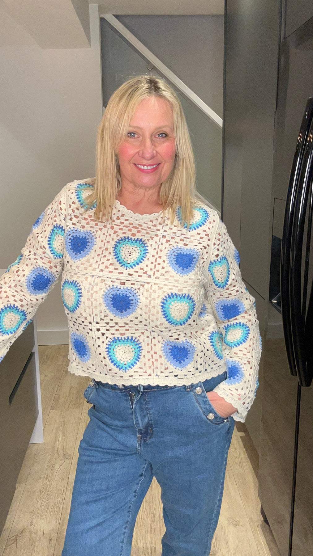 - Cream crochet top with heart details in shades of blue