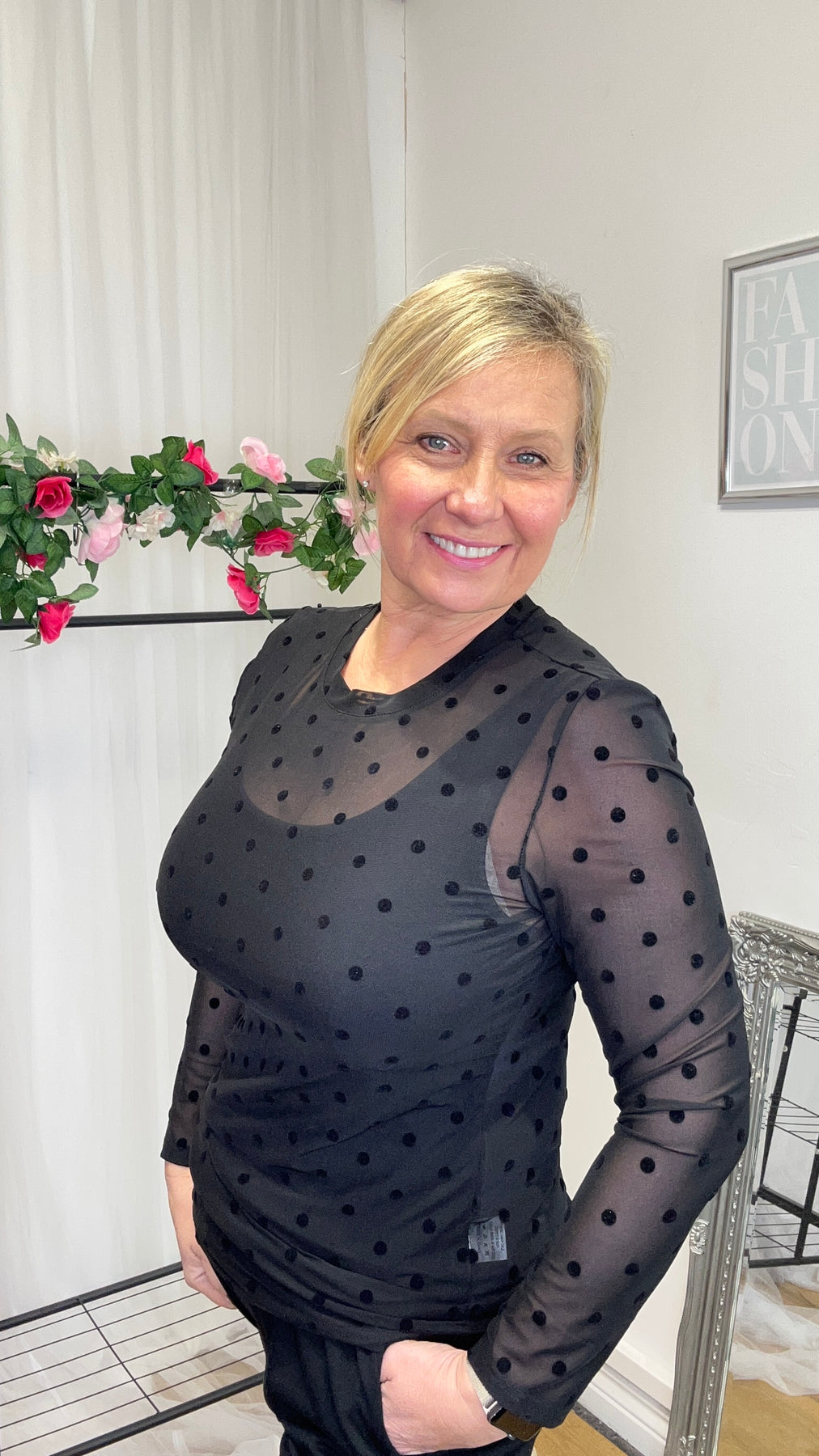 Regular price £21.00- Spotty print mesh top in Black