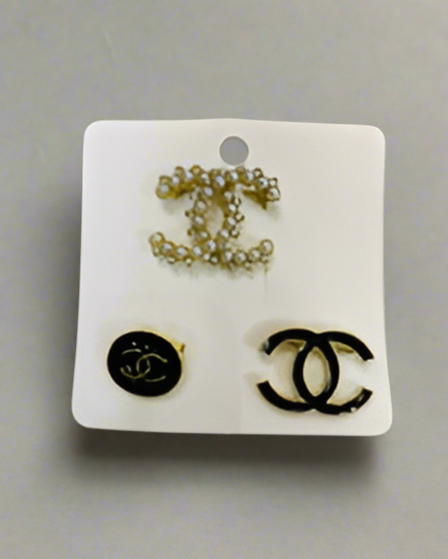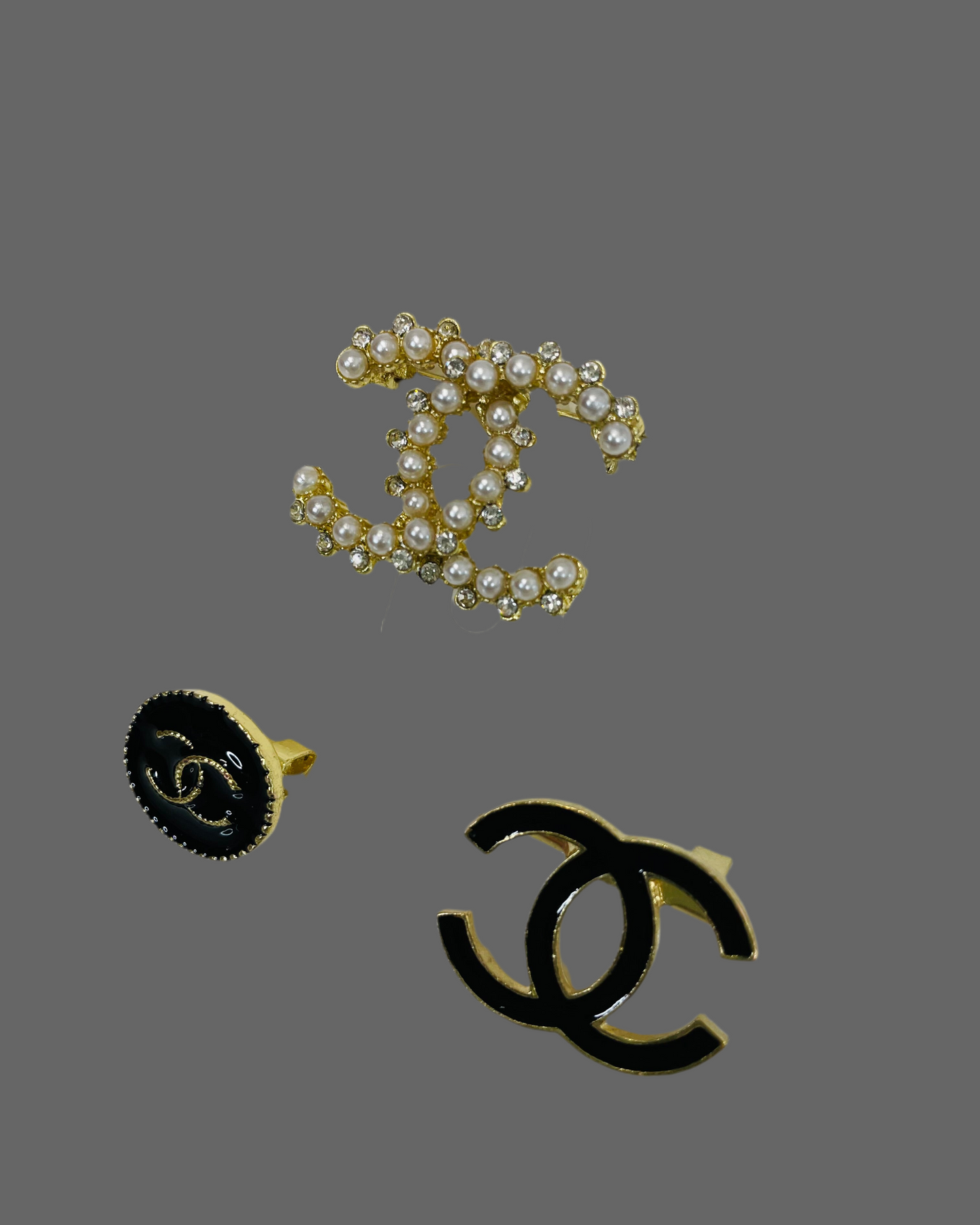 - One brooch is CC in small pearls & gold, one is in black & gold & the third one is circular with CC in the centre
